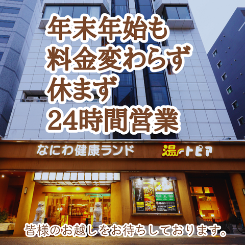 「なにわ健康ランド湯~トピア」は24時間、定休日なしで営業しておりますので、ご自身のペースで心ゆくまでお風呂やサウナをご堪能いただけます。