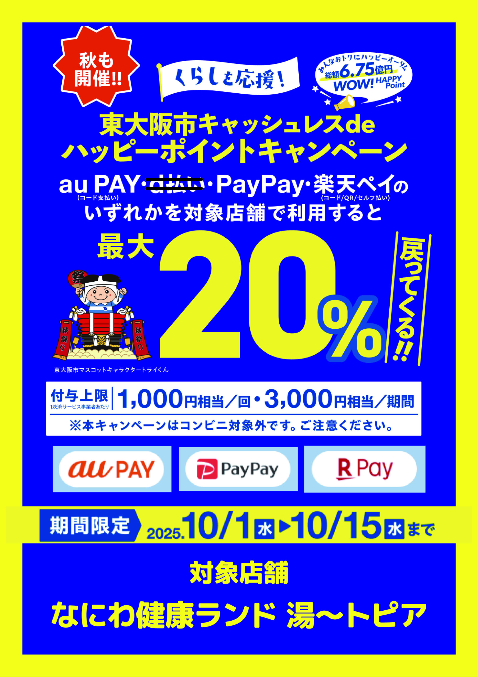 いつもなにわ健康ランド湯~トピアをご利用いただきありがとうございます。10/1(水)~10...