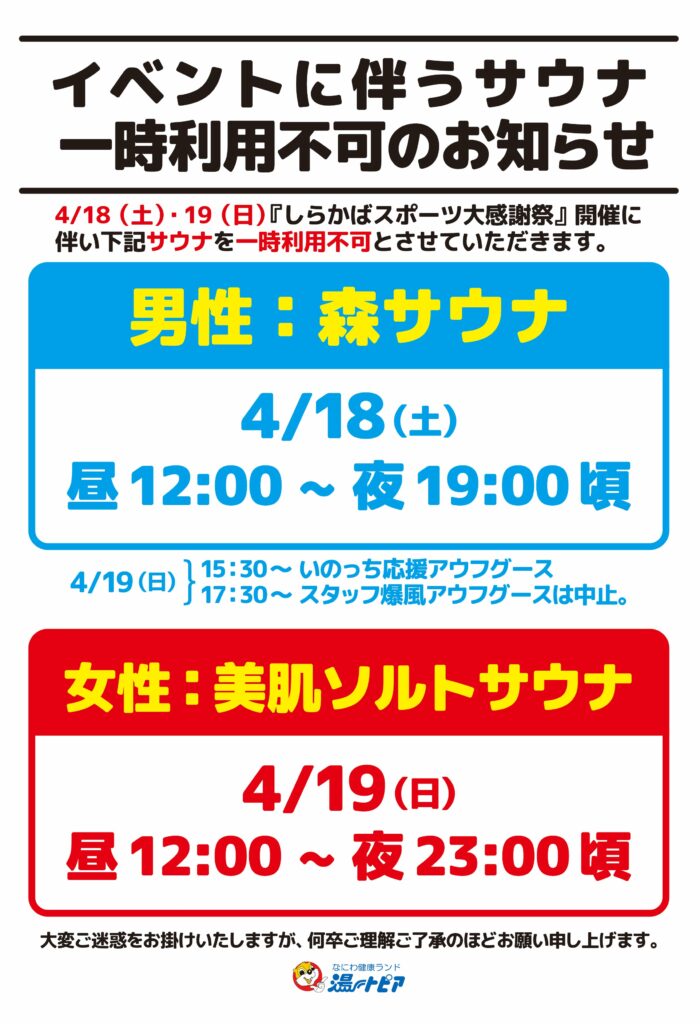 4/18・19イベントに伴う一部サウナ利用不可のお知らせ