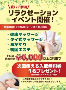 イベント内容:健康マッサージ、タイ式マッサージ、あかすり、韓国エステの施術合計6,000円以上で次回利用できる入館無料券をプレゼント